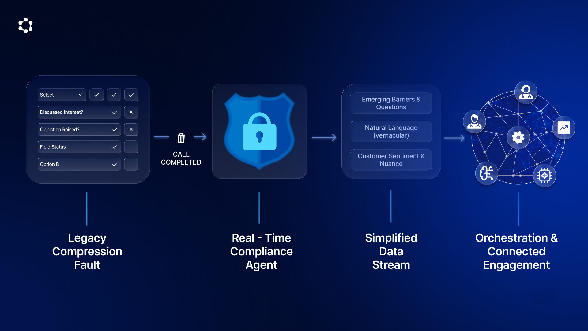 Due to legacy compliance concerns and rigid database schemas, organizations force field teams to summarize complex dialogues into predefined drop-down selections. The richness of the human conversation is compressed into a binary "Call Completed" metric.